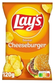Ingrédients : Pommes de terre ( 62%), huiles végétales (tournesol, colza, maïs en proportion variable), base aromatisante cheeseburger poudre de PETIT-LAIT, arômes (dont céleri, moutarde), fructose, sel, sucre, oignon en poudre, ail en poudre, graine de moutarde en poudre, acidifiant (acide citrique), curcuma, chlorure de potassium, colorants (extrait de paprika, curcumine).