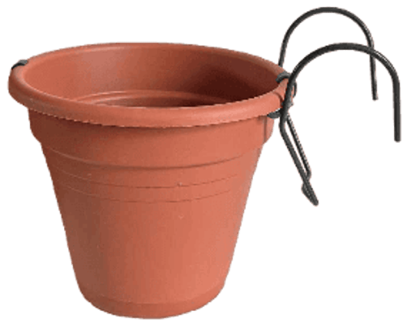 Pot de fleur percé avec crochets de suspension et bac de récupération.